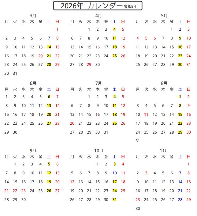 黄色のマーカーの日が講義になります。毎週土曜日11:00~17:00【牧店】